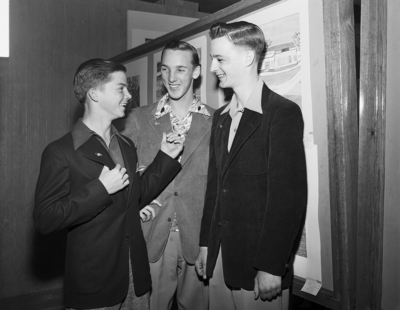 This trio of young Amon Carter Riverside artists have won seven keys between them in Regional Scholastic Awards competition, the 1950 exhibit of which opened at Stripling's. Left to right, Jerry Williams, son of Mr. and Mrs. J. M. Williams, 2815 Murphy, is a two-key winner; Billy Hendricks, son of Mr. and Mrs. B. B. Hendricks, 1122 Bonnie Brae, can wear three keys on his lapel, and Billy's brother, James, is a two-key winner. They're pupils of Mrs. Resa Oglesby.