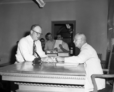 Ray Finney, left, foreman of Tarrant County's special grand jury is shown handing to Judge Dave McGee of Criminal District No. 2. The jury's final report dealing with the body's prolonged investigation of gambling and alleged bribery. Ray Finney and Judge Dave McGee is shown seated on a desk. Published in Fort Worth Star-Telegram evening edition August 22, 1951.