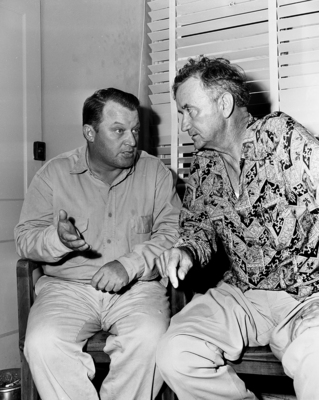 Hubert Deere, left, explains to Sheriff Bill Barker of Durant Oklahoma, why he fired the shotgun blasts that killed Jim Thomas, Fort Worth ex-convict. Published in Fort Worth Star-Telegram morning edition, August 23, 1951.