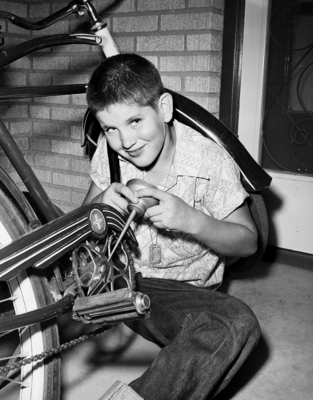 Dick Cantrell, son of Mr. and Mrs. G. S. Cantrell of 4209 El Campo, isn't going to let the fact he had polio twice keep him out of the running in the Recreation Departments bicycle rodeo. He is shown giving his bicycle a good oiling for the staff competition. Dick Cantrell is shown oiling his bicycle in the photograph. Published in Fort Worth Star-Telegram evening edition, August 24, 1951.