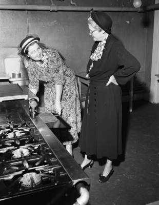Mrs. V. W. Boswell, left, social service chairman, and Mrs. E. P. Haltom, special fund co-chairman, proudly inspect the cooking range the Ladies of Rotary donated to the Fort Worth Children's Hospital.