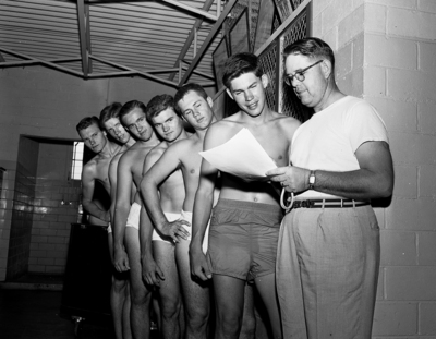 N. J. Hogan, Arlington Height coach, checks the weights of six probable starting line men. Left to right, John Fox, 175; Excell Amyett, 185; Bob Wilkes, 190; Gene Beveridge, 165; Joe Keeton, 172, and Jim Pruitt, 175. Published in Fort Worth Star-Telegram evening edition, August 23, 1951.