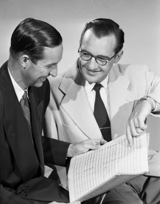 Kenneth Vaughan, left, president of the Texas Bandmasters Association, listens as Lewis Gillis, Texas Christian University band direction, discusses his new composition, "Suite for Band". The Gillis music will be played at the annual meeting of the association in San Antonio. Published in Fort Worth Star-Telegram morning edition, August 26, 1951.