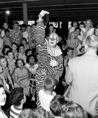 Clarabelle is shown pantomiming a clown at the Leonard's Department Store. Published in Fort Worth Star-Telegram morning edition, August 25, 1951.