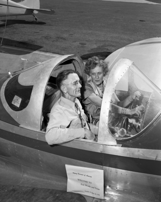 Among early arrivals at Meacham Field for the National Flying Farmers Association convention opening at Hotel Texas were Fred B. Triplett of Hillsboro, convention chairman, and Miss Ama Lee Jameson of Brackettville, convention secretary, shown discussing plans for welcoming the flying delegates. Published in Fort Worth Star-Telegram morning edition, August 25, 1951.