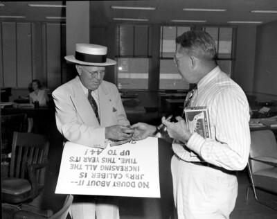 James R. Record. Mr. Record's 44th anniversary with the Star-Telegram. Shown receiving congradulations from Amon Carter and George Woodman.