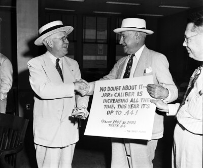 James R. Record. Mr. Record's 44th anniversary with the Star-Telegram. Shown receiving congradulations from Amon Carter and George Woodman.