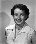 Mrs. Jack Martin, the former Miss Peggy Jane Schow, and her husband, recently married here, have returned from a wedding trip to Colorado Springs and are at home at 811 Clairemont. She is the daughter of Mr. and Mrs. P. E. Schow 3713 Linden. A photo of a woman smiling wearing a pearl necklace around her neck.
