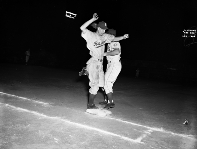 Beaumont's Marty Carlson puts on a sprinter's finish, but he is too late at first base in the fourth inning of the game at La Grave Field. The Cats' Al Flair had the ball. Published in Fort Worth Star-Telegram morning edition August 26, 1951.