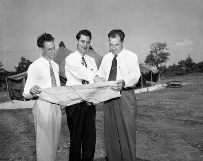 Charles McLaughlin, left, Reverend Kip Owen, center, and H. L Murphee look over plans for the new Castle Hills Baptist Church. Ground for the first unit of the new church is slated to be broken within two weeks. Tent in background is present meeting place of the congregation. Published in Fort Worth Star-Telegram morning edition, August 27, 1951.
