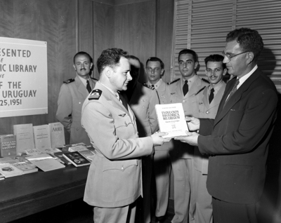 The Republic of Uruguay presented 65 books to the Fort Worth Public Library on the 126th anniversary of the Republic's independence day and in token of friendship between Uruguay and the United States. Making presentation to Librarian J. S. Ibbotson, at right, is Commander Oman F. Aguirre of the Uruguayan Naval Air Force, who is commanding officer of a 25 officer detachment at Cobell Supply Corporation here. In background are left to right, Lieutenant Oscar Llornes, Lieutenant Enrique Falco, Lieutenant Hugh Martini, and Ensigns Americo Noble and Luis Rivero. Cobell has a contract with the republic to rebuild naval aircraft. Published in Fort Worth Star-Telegram morning edition, August 26, 1951.