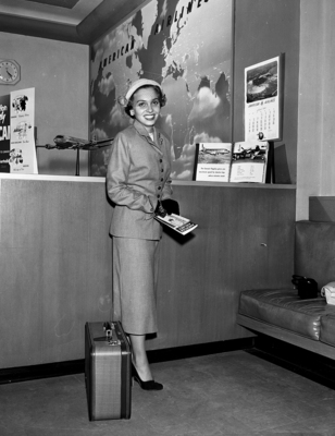 For her airplane trip to Atlantic City, Miss Jane Holcomb selected an Athea of California suit of gray gabardine, styled with small double collar and turned back cuffs. The Valle hat is of gray imported fur with gold trim and an across-the-eyes veil. Published in Fort Worth Star-Telegram morning edition, August 26, 1951.