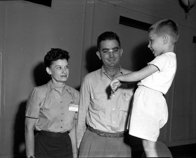 Ned Holme, 5, who came with his family all the way from New York to attend the flying farmers meetings here, shows how he's going to do it when he's old enough to take the controls. His "students" are Mrs. Forrest Watson of Thomas, Oklahoma, widow of the group's first president, and Ed Ferrell of Mountain View, Oklahoma, charter member.