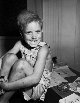 Tommy Wooten, young boy who ran away from home. A child smiling and sitting down with his knees up.