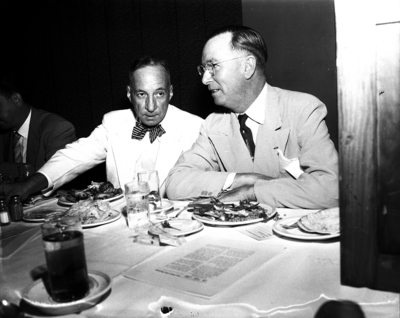 Web Maddox, left, Southwest region chairman for the Crusade for Freedom, and R. Wright Armstrong, Fort Worth citizens to back the 1951 Crusade at a luncheon at Hotel Texas. Two men talking at a table filled with plates of food and has drinks on the table. Men are wearing suits and ties.
