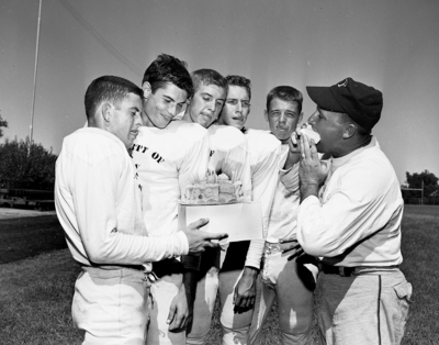 When admirers came up with a birthday cake for Poly's Paul Wilson, third from left, at football practice, Assistant Coach Preston Thompson thought it was a fine idea. He ate the cake while the grid men, on a training diet, looked on hungrily. Left to right are Jim Brock and Bill Enis, backs: Wilson, a center; Don Leaman and Bill Estill, ends, and Thompson. Published in Fort Worth Star-Telegram morning edition, August 28, 1951.