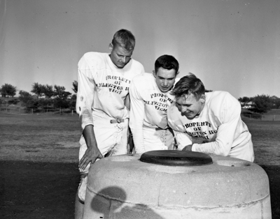 Robert Howington, left and Edward Watkins wait their turn as Sonny Neal prepares to take a big drink of water during an intermission at Arlington Heights football practice. Published in Fort Worth Star-Telegram morning edition, September 1, 1951.