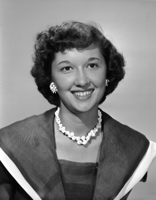 Ann Garrison, 17-year-old University of Texas sophomore, will be a candidate for queen of Labor Day picnic at Sycamore Park. Miss Garrison, daughter of Mrs. Clay Garrison of 3210 Childress, is being sponsored by the Ladies Auxiliary of the Fire Department. Her father was the late Captain Clay Garrison. A portrait of a woman smiling wearing earrings and her big pearl necklace.