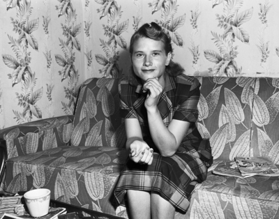 A 36-year-old ex-Wave who struck a young housewife and then was marched to jail by her victim gave this explanation for her actions: "I thought the woman was going to make fun of the way I walk". A photo of a woman sitting down wearing a dress and smiling on the couch.