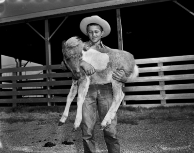 Sammy Shugart, 15, of Gainesville, had a hug for the 3-month-old, 25-pound Shetland colt that arrived with other Gainesville Community Circus animals. The famous circus will open a three-night run at Will Rogers Memorial Coliseum, sponsored by a department store. A teenage boy wearing a cowboy hat holding a young pony or baby horse.