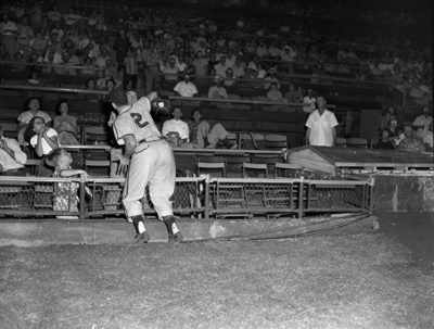 Small fan, left, watches with awe as Shreveport First Baseman Bob Belford makes into-the-stands catch of foul off bat Cats' Bill Sharman at La Grave Field. Published in Fort Worth Star-Telegram morning edition August 28, 1951.