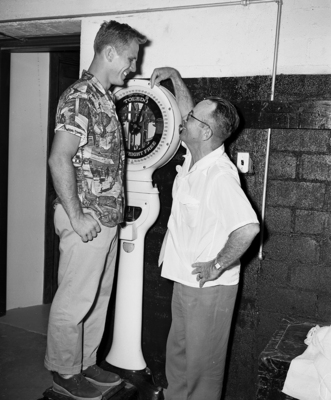 Texas Christian University Coach L. R. (Dutch) Meyer (right) grins as Quarterback Gilbert Bartosh tips scales at 170 pounds after checking in for Purple grid workouts. Published in Fort Worth Star-Telegram morning edition, August 31, 1951.
