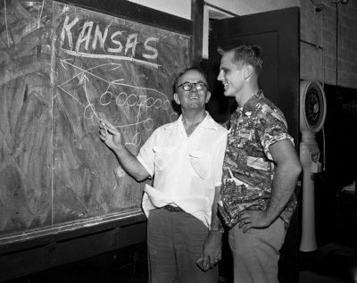 Coach L. R. (Dutch) Meyer of Texas Christian University shows play diagram to Tailback Gilbert Bartosh to use against Kansas football season opener in September 22. Published in Fort Worth Star-Telegram evening edition, September 1, 1951.