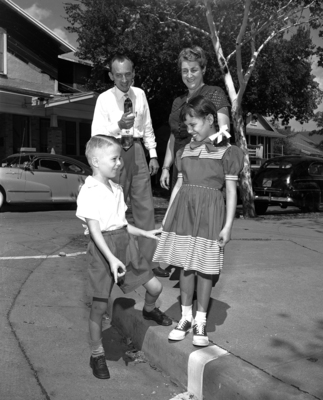 Miss Clarice Jackson, principal of Alexander Hogg Elementary School, and Larry Graff, safely director of Fort Worth Safety Council, explain the proper way of crossing the street to first graders Robert Moore, son of Mr. and Mrs. Robert Moore, 609 May, and Linda Saldana, daughter of Mrs. L. S. Saldana, 615 May.