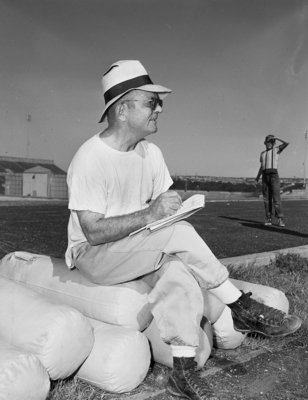 Coach L. R. (Dutch) Meyer of Texas Christian University turned out for drills in the straw hat with sun glasses. Published in Fort Worth Star-Telegram evening edition, September 1, 1951.