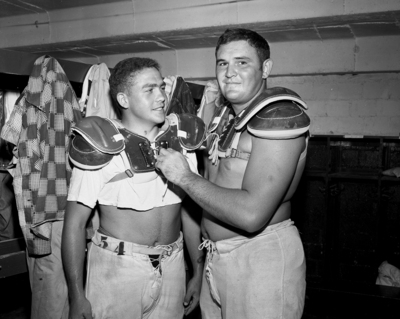 Carlton McCornmack (right), Frog's first-string center, helps chief rival Bob McEachern with his pads as two pivot men prepare for practice session. Published in Fort Worth Star-Telegram morning edition, September 9, 1951.