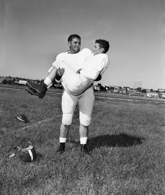 Carlton McCormack, center and Texas Christian University's largest squad member, 245 pounds, holds Frogs' smallest, 150-pound Marshall Robinson, a back. Published in Fort Worth Star-Telegram evening edition, September 1, 1951.