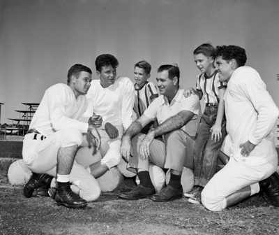 Sophomore grid men Glenn Jones, Danny Powell and Morgan Williams, left to right, chat with ex-Frog all-America tackle I. B. Hale, center, and his twin sons, Bob, left, and Bill, right, age 11. Hale played on Texas Christian University' 1983 national championship team. Published in Fort Worth Star-Telegram evening edition, September 1, 1951.
