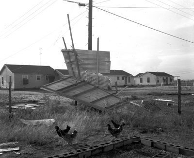 Four homeless chickens wander aimlessly past the remains of their new home after it was destroyed by a wind storm. Wreckage of the chicken house, owned by R. L. Wiggins, 3125 Wesley, was scattered along a half-back course. A house in the background, grassland with four chickens around a chicken coop.