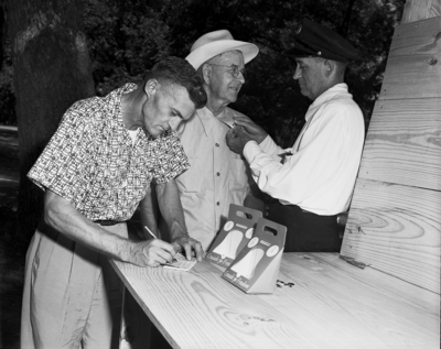 Fire Captain Frank Inman, right, pins a button on B. G. Schmidt, carpenter, as H. E. Luster, another carpenter, signs his name to the 1951 Crusade for Freedom campaign which was opened at the Labor Day picnic in Sycamore Park. The national campaign a rededication against communism and support for Radio Free Europe has a goal 95,000 signatures and $20,000 in Fort Worth, which led all Southwestern cities last year.
