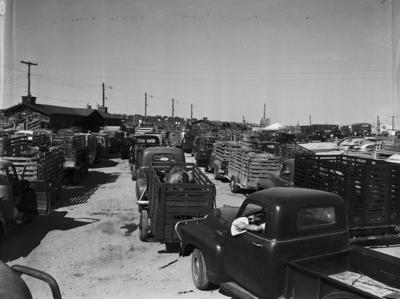 Trucks and trailers lined up at the Fort Worth Stock Yards to unload the largest cattle run there since the fall of 1949. A total of 9,536 cattle and calves had been unloaded.