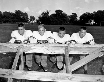 Lettermen in Amon Carter Riverside line get workout on blocking sled. Left to right, Tackle Addison Maclin, Guard Harry Hensen, Center Dwayne West and Guard David Chapman. Published in Fort Worth Star-Telegram evening edition, September 4, 1951.
