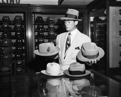 Bob Malone of 2816 Purington tries to choose a new hat to wear on felt hat day Friday. He favors the soft sage green felt he is wearing, but is tempted by the new pork pie sport hat with the feather in the band.