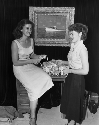 Mrs. Kitty Ruth Bryce, left, and Miss Gay Martin, prepared name cards for the annual rush party of Avolonte sorority, held at the home of Miss Dorothy Thornton in Arlington. Avolonte is one of four social clubs at Arlington State College. Kitty is sitting on the edge of a desk, and on the desk are bunches of ribbons.