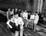 Heavyweight Tom Adams carries flyweight Pat McCarthy as Texas Golden Gloves champions pose at the railroad station before their departure for Chicago, where they fought for bigger titles. Left to right in the background are Campbell Woodman, Adolfo Martinez, John O'Glee, Alfred Flores, Jack Woodruff, Wallace Willard, Fred Morales, Tony Maiorana and Ferrell Snider. Published in the Fort Worth Star-Telegram morning edition, February 26, 1950.
