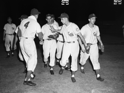 Don Otten (4) congratulates Vicente Lopez on stopping Oklahoma City threat in ninth as Joe Torpey and Bill Hunter (right) head for locker room. Manager Bobby Bragan is behind Otten, Cats won, 2-1. Published in Fort Worth Star-Telegram evening edition September 10, 1951.