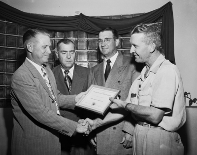 S. A. Gross, left, of the American Safety Engineers presents safety certificate to, left to right, George A. Frazier of Consolidated Vultee Aircraft Corporation, J. C. Crowder of Consolidated Chemical Industries, Inc., and Irby Crawford of the downtown Lions Club.