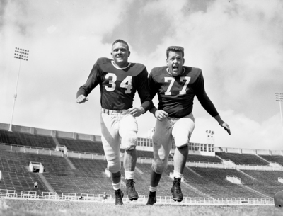Keith Flowers, left, and Douglas Conaway may have a lot to do with determining whether Texas Christian University - Kansas game turns into an offensive show or not. They are Frog linebackers. Published in Fort Worth Star-Telegram morning edition, September 19, 1951.
