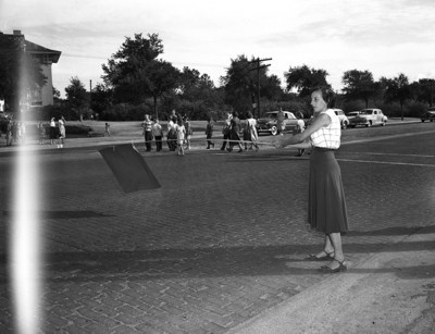 Mrs. Powel McCreary, a member of the unofficial squad of Arlington Heights Elementary School, flags traffic so children can cross the street. She was one of several members of the PTA who assisted in the school's traffic problems.
