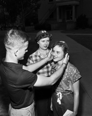 Ann Reed of Ennis, Texas Christian University freshman, accepts an assist from Frank Talley of Fort Worth.