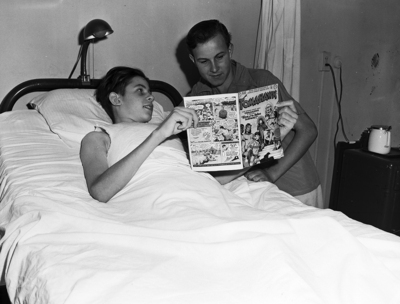 Andrew Strelnieks, 15, in bed shows John Kreiter, 16, an American institution, the comic book. And John, who has been in the United States only 10 days and speaks no English, tries to understand. Both came to this country from Europe as displaced persons.