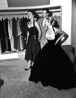 Oleg Cassini, designer who will show his clothes, inspects models wearing his creations. At left is the dress he calls "Little Sin", fashioned with a halter neckline and shirred bodice which can be covered with a high-collared bolero. The evening gown is of black velvet with pearl satin inset. It, too, has a cover-up jacket.