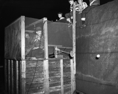 Plaid-shirted Mayor Duwe of Lewisville (in dunking cage) watches with relief as a wild pitch misses the target that would have sent him feet-first into a pool of cold water. Scene is at a civic carnival being held by Lewisville to raise $600 to complete the volunteer firefighter's hall.