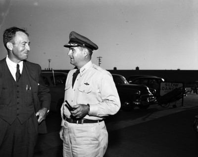 LaMotte T. Cohu of San Diego, left, president of Convair, producer of the B-36 bomber welcomes Lieutenant General Edwin W. Rawlings, commanding general of the Air Material Command, on the latter's arrival at the Convair plant from his headquarters at Wright-Patterson Air Force Base, Dayton, Ohio.