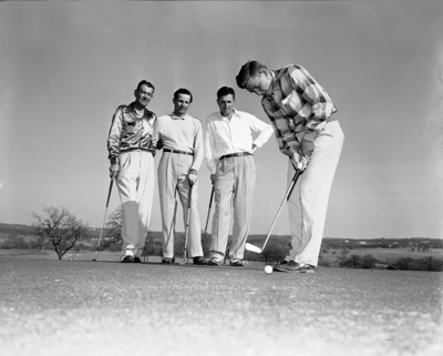 Bill Flowers puts his golf ball towards the cup on Meadowbrook's Number 18 as other members of the foursome, George Bruno, left, T. A. Avarello, center, and Allen Pilgreen, right, watch him play. Published in Fort Worth Star-Telegram morning edition February 26, 1950.