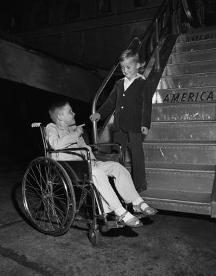Barry Todd, in wheelchair is shown as he reassured Jerry Gordon, 7, before Jerry boarded a plane for New York, where he will receive treatment for muscular dystrophy. Barry recently flew to New York for treatment of the same ailment. Jerry is the son Mr. and Mrs. Paul E. Gordon. Barry's parents are Mr. and Mrs. H. O. Todd